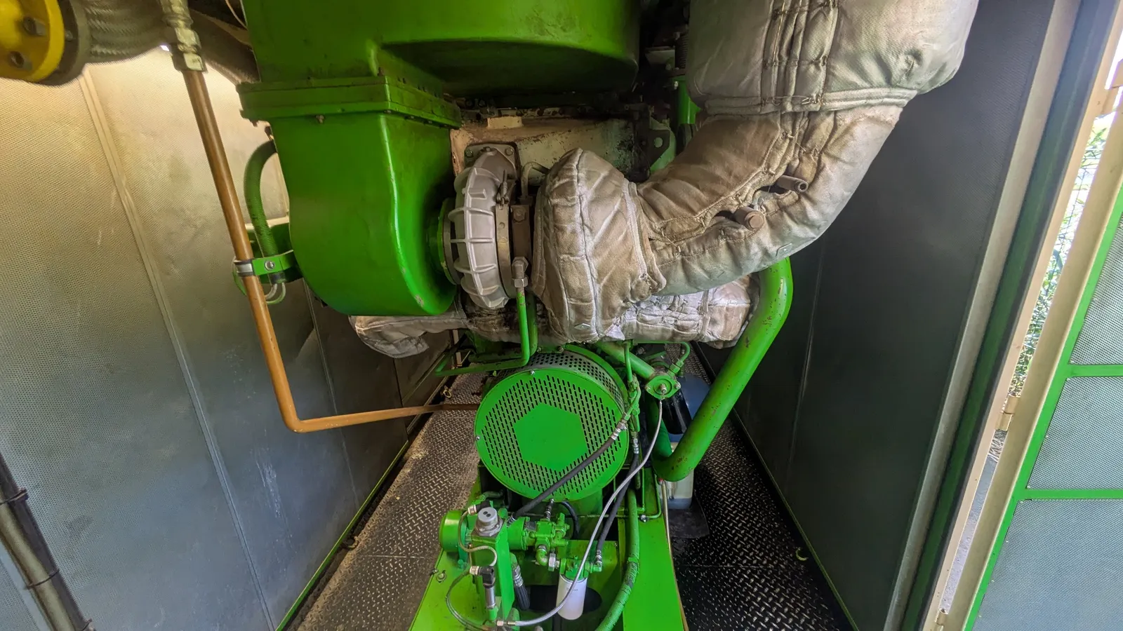 Équipements inclus : Armoires de contrôle DIA.NE TX, silencieux, échangeur thermique, ligne d’échappement complète, toiture avec skid (échangeur à plaques et fumées).